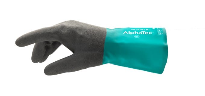 Glove AlphaTec® 58-530W in nitrile with unmatched combination of chemical resistance, secure grip and a comfortable inner lining makes this glove ideal for outdoor use. Grip Technology™ that enables users to handle wet or oily objects with less power and better control. The combination of fluid resistance, chemical resistance and good grip together with flexibility and good dexterity make it a logical choice when working with chemicals. Suitable for metalworking and assembly, body painting including surface inspection, change of tools and molds, cleaning of tools, loading and unloading of trucks and vehicles, transfer of liquids and solids, handling of outgoing goods, and opening of furnaces, drainage pumps, valves or lines. Length: 30,5 cm. Bundle: 12 pairs. Carton: 144 pairs.