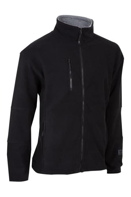 Fleece jacket with contrast color in neck, zippered chest pocket on right side. Two zippered front pockets. Black lycra band in sleeve ends. Adjustable hem.