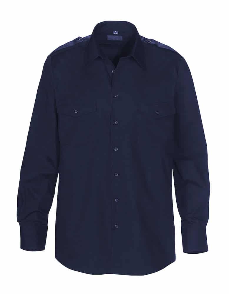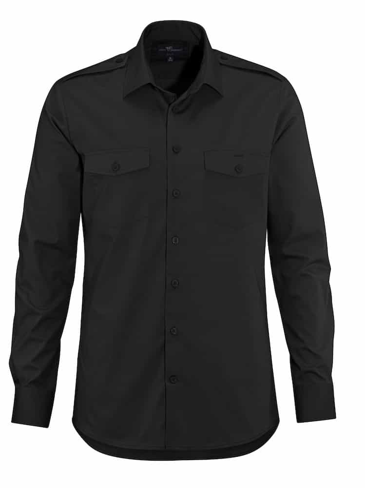 Pilotshirt with flaps on the shoulders, double breast pockets with lid. Tone in tone buttons, turndown collar. Comfort fit.